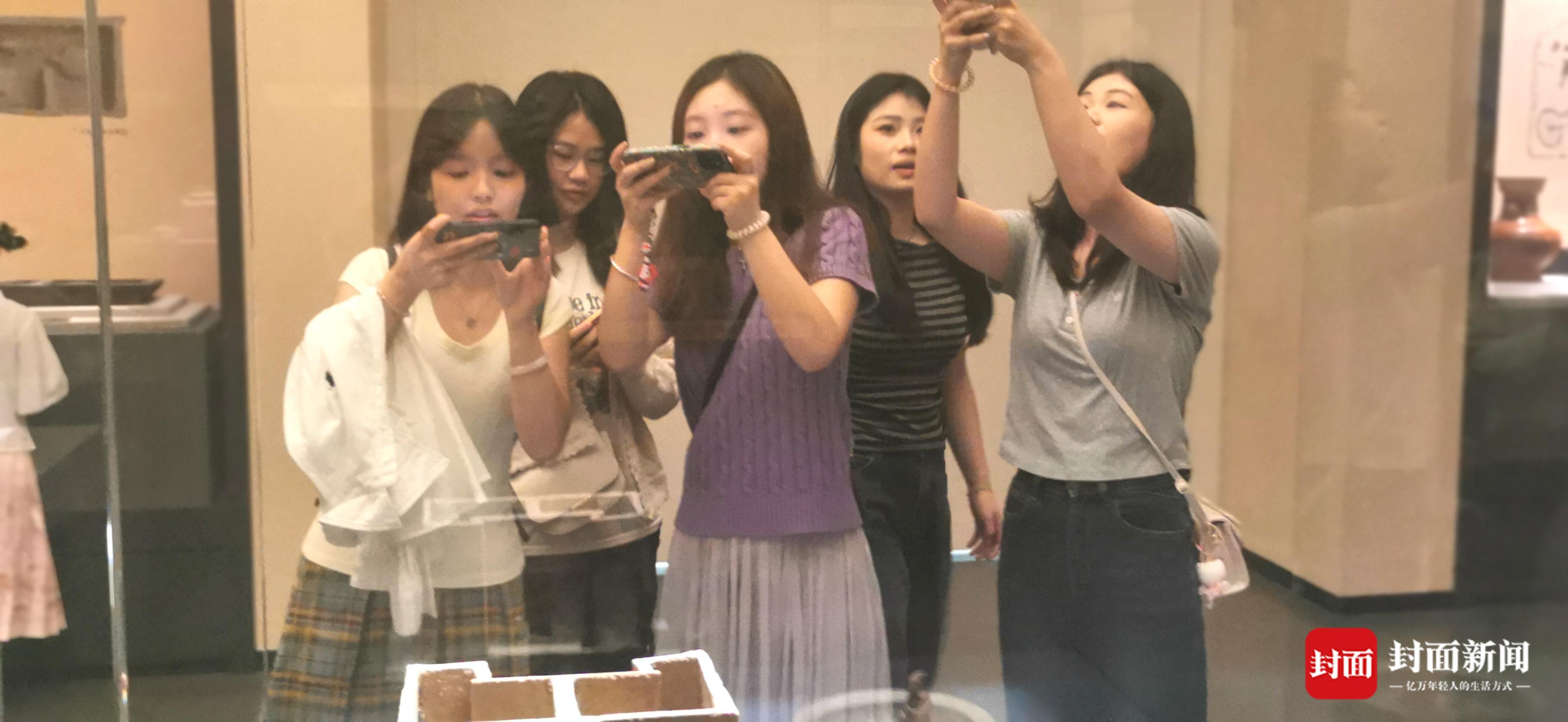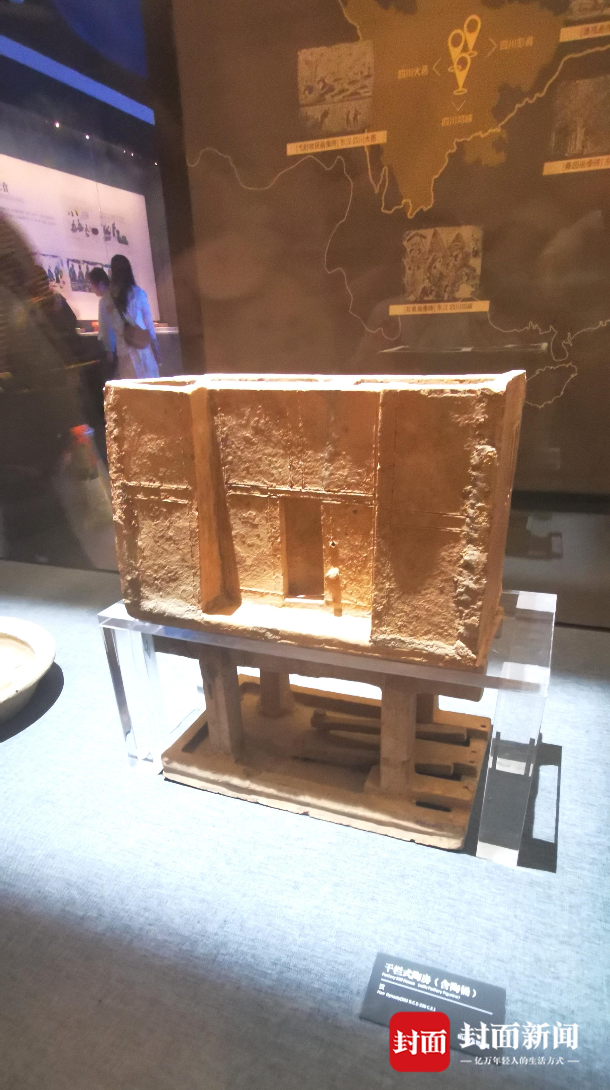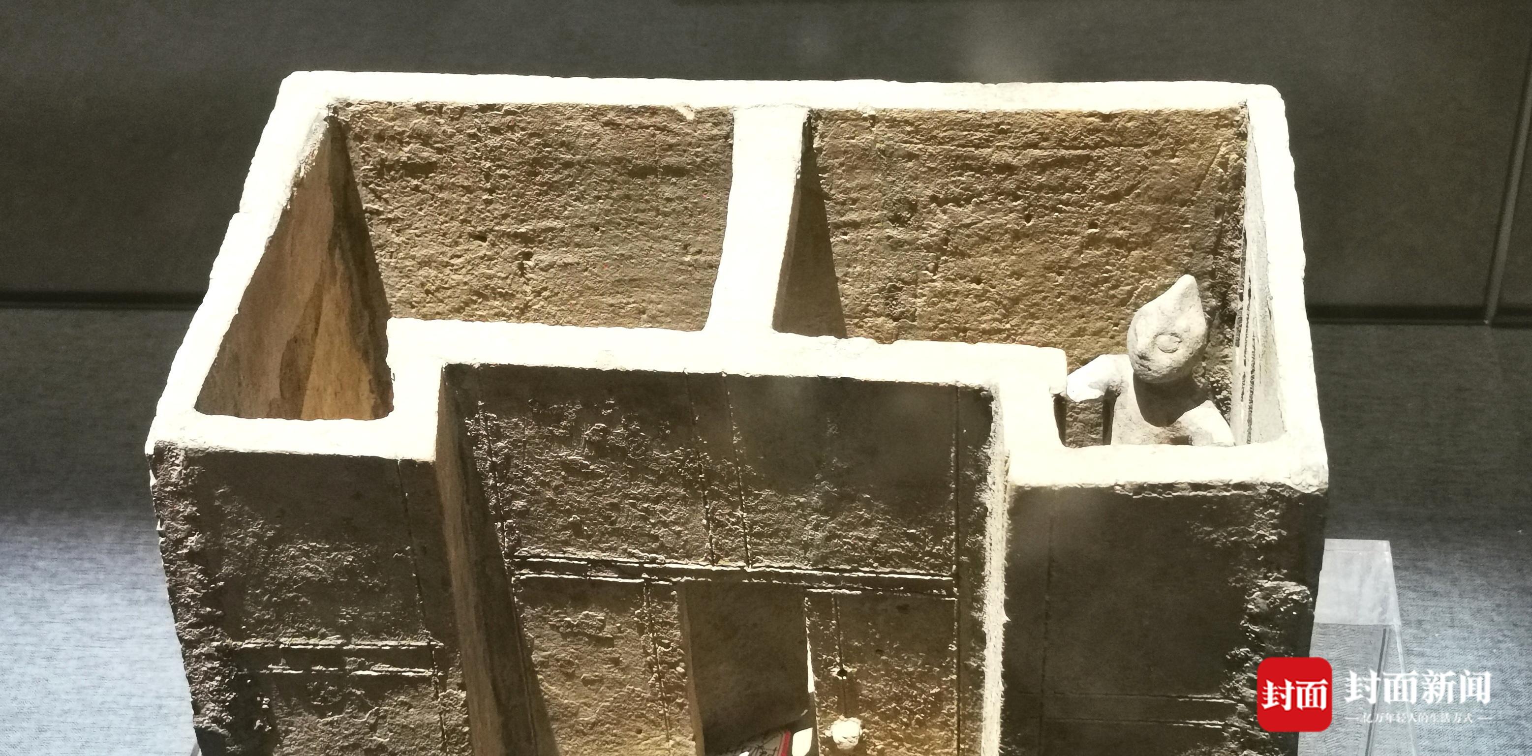 封面新闻记者随游客来到南充市博物馆,二楼嘉陵长歌展厅看到了“奥特曼”,一间陶制小房子里,一个人形小陶俑站在角落,脑袋尖尖,眼睛大大,手臂微微翘起外形很像动漫角色奥特曼。陶俑出土于汉代,头部造型特别,宛如戴有冠帽, “确实很像,很逼真,历时2000多年了,还这么生动,眼里真的有光!”西安游客宋女士边拍边感慨。